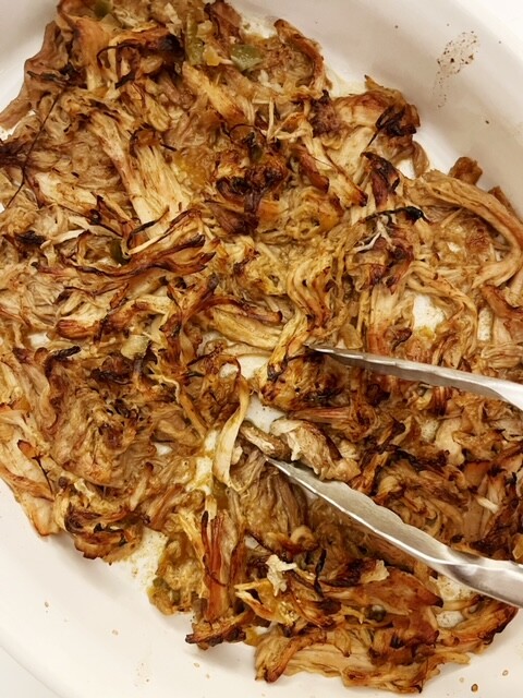 - Shred the meat in the slow cooker (remove any large pieces of fat) and transfer to a baking sheet lined with foil (use a slotted spoon to do this, but it's okay if some of the juice makes it to the pan).