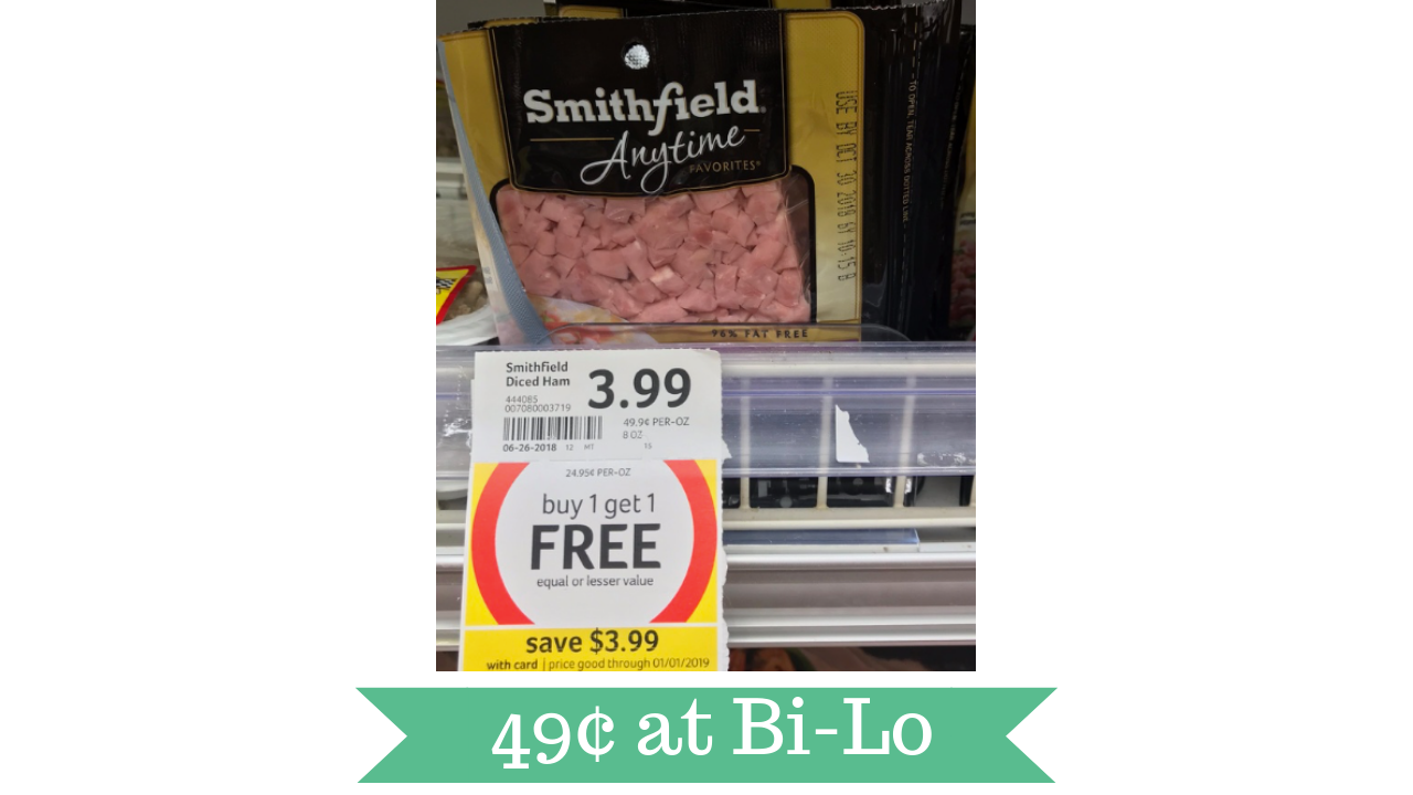 Hurry and print this hot Smithfield coupon for great savings on Smithfield Anytime Favorites product. Use it during the Bi-Lo sale and pick up diced ham for just 49¢!