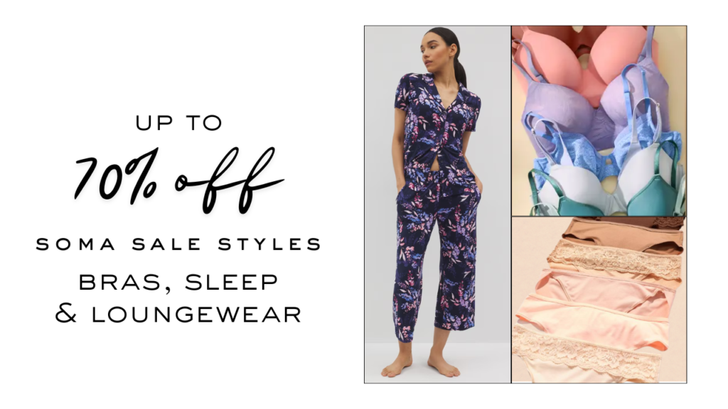 Soma is offering up to 70% off bras, panties and sleepwear during their Semi-Annual Sale. If you need a restock, this is the time!