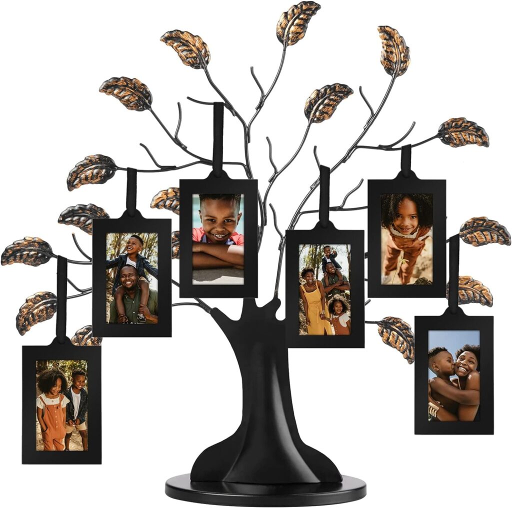 Include photos in a decorative family tree frame with spaces for photos of each family member.