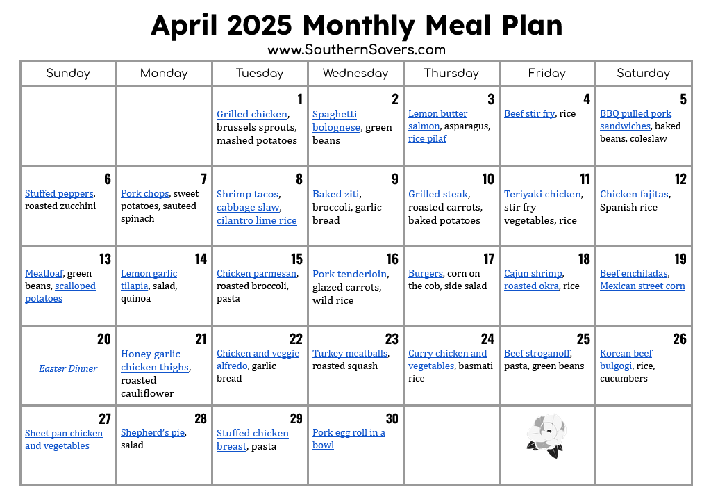 Southern Savers FREE April 2025 Monthly Meal Plan