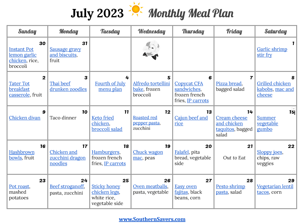Southern Savers FREE July 2023 Monthly Meal Plan