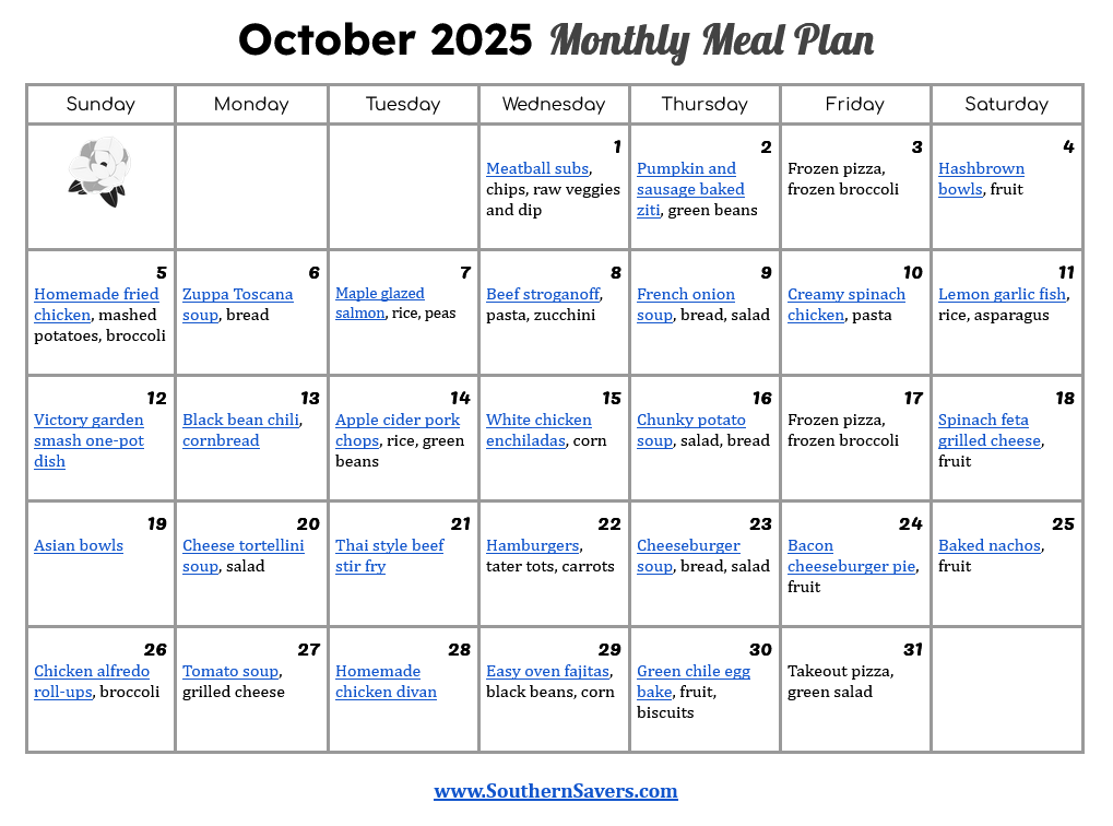 Home > Frugal Living > Southern Savers FREE October 2025 Monthly Meal Plan