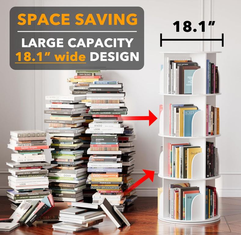 Make your books neat and organized with this rotating bookshelf tower lazy susan!