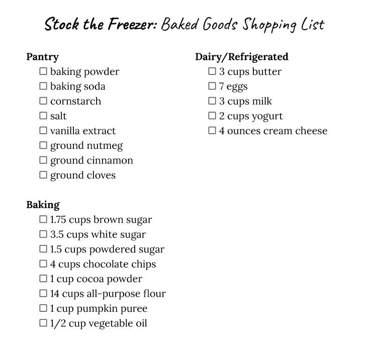 It’s time for another installment of our stock the freezer series. This time, we’re focusing on stocking the freezer with baked goods. You can enjoy all of these recipes with your own family, but I also love having these in the freezer to make hospitality easier. I can thaw the cookies before we have guests for dinner, or I can take a loaf of pumpkin bread to a new mom in our church. At the end of the post is a printable shopping list so that you can make one batch of each recipe all at the same time!