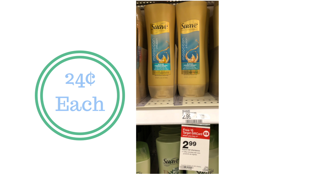 (buy (4), use (1) $3/2 and (2) $1.50 off, makes it 24¢ ea.) - $5 Target Gift Card wyb (4) Hair Care Items – Suave Professionals Styling, $3.89