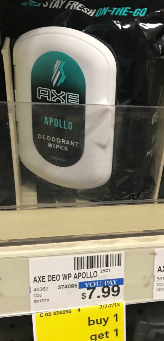Axe on-the-go Deodorant Wipes 25 ct. – With classic sandalwood and sage scents, these wipes help wipe away odor for a refreshed feeling anytime, anywhere. Pair them with Axe Apollo Antiperspirant to stay fresh and protected all day.