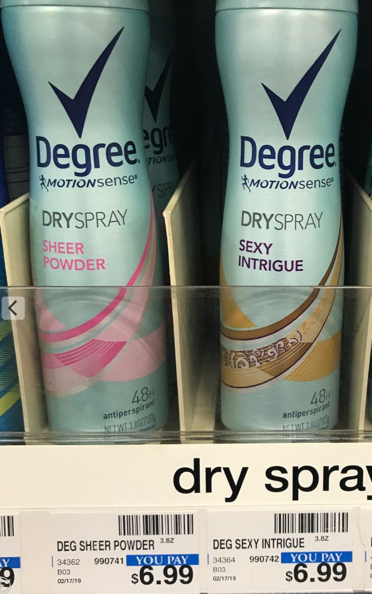 Degree Women Antiperspirant Deodorant Dry Spray 3.8 oz – Goes on instantly dry for a cleaner feel. Degree Women also offers MotionSense technology that activates when you move. This provides 48 hour sweat and odor protection, while leaving no visible residue.