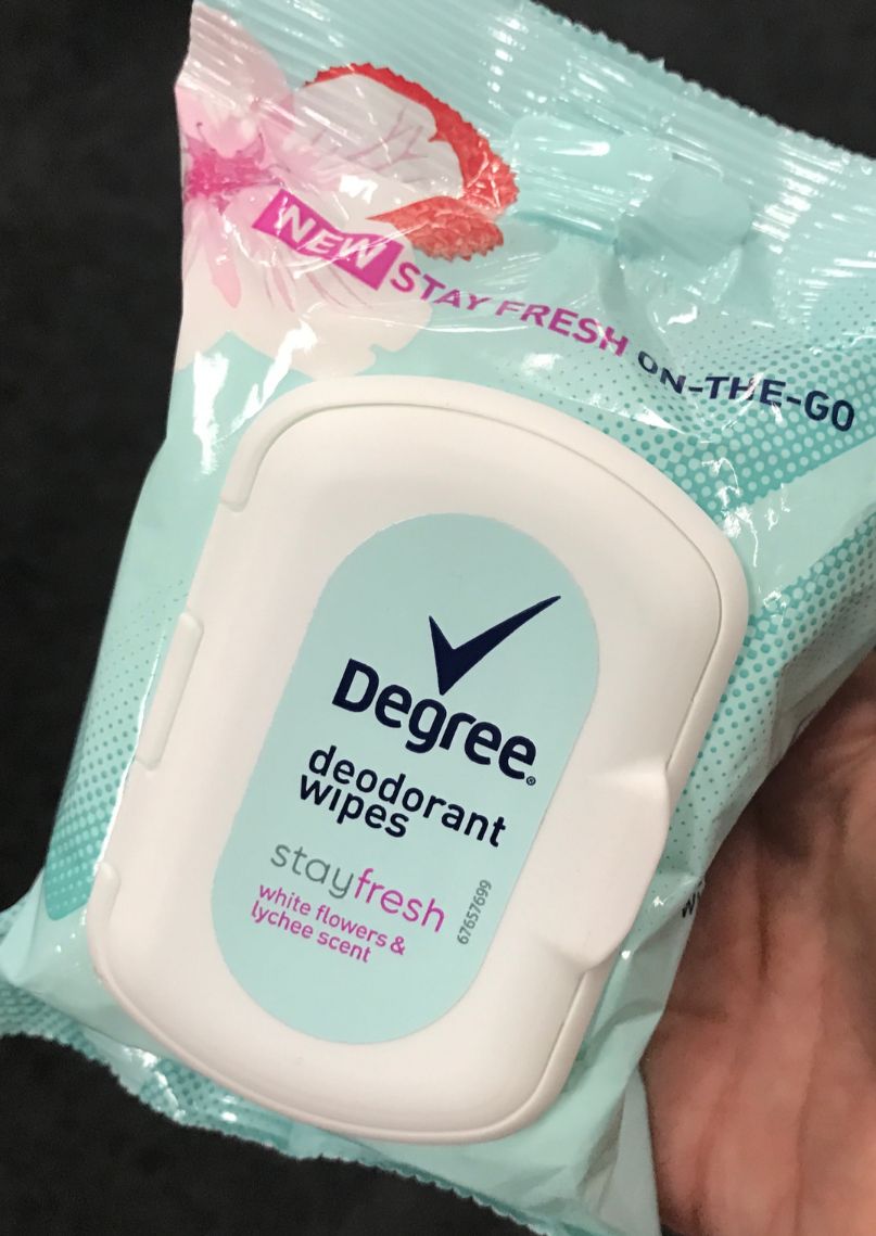 Degree Female Stay Fresh on-the-go Deodorant Wipes 25 ct. – If your on the go, use these wipes to freshen up after workout, post commute, or anywhere you need them. They are in a resealable packet that can travel with you. They wipe away odor and leave you with a fresh scent.