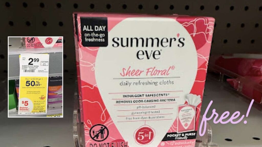 Head over to your local Walgreens where you can take advantage of a Register Rewards offer and a B1G1 50% off sale to get Summer’s Eve Cleansing Wash or Wipes for FREE + profit!