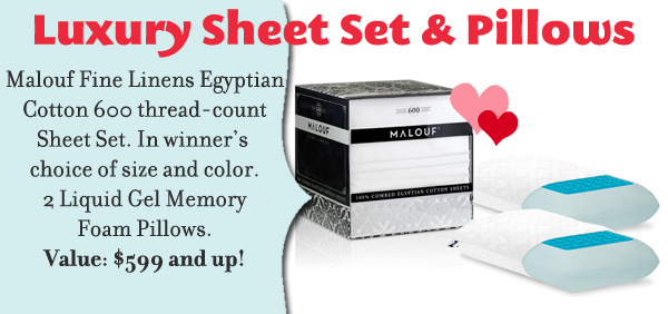 Malouf Fine Linens is offering one winner a set of their luxury (really!) Malouf Egyptian Cotton 600 thread-count sheets, in the winner’s choice of color and size. Plus, receive two of their newest, top-of-the-line Liquid Gel Memory Foam Pillows (valued at $179 each!). The gel infusion creates a softer, cooler, ‘doughier’ memory foam, like nothing you’ve ever slept on. Ahhhh…feel like royalty and cuddle up!