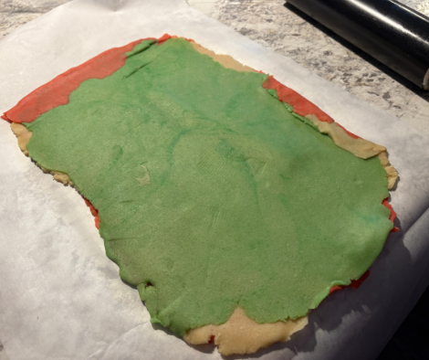 The next day, when you’re ready to make the cookies, let the dough sit out for about 15 minutes and roll each color out. You want a rectangle about 1/8th inch thick, but it’s hard to do that perfectly, so I rolled out a very round rectangle and fold the edges over, then it will roll out better into a rectangle.