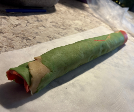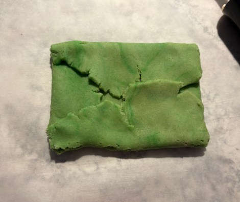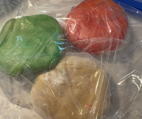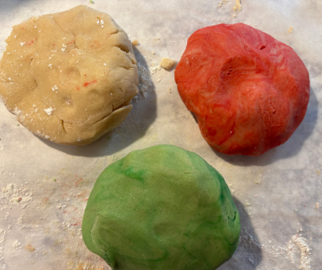 - Add red food coloring to one third of the dough and green to the other. Mix into both doughs are solid colors.