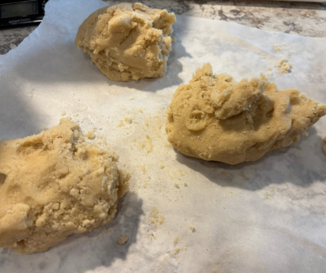 Dump the dough onto parchment paper and divide into three equal portions (use a kitchen scale if you want to be very precise!).