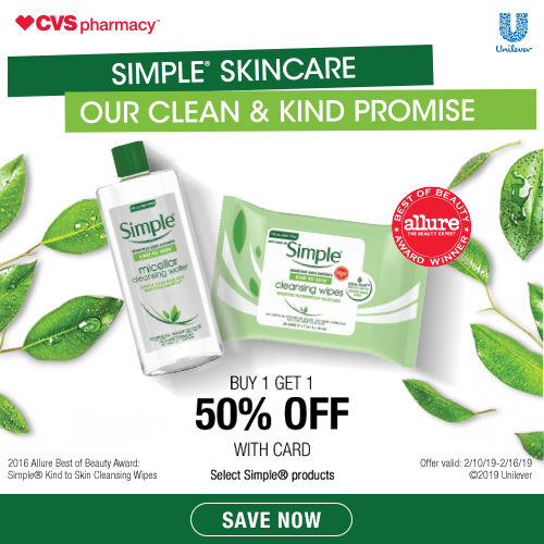 Grab a few things this week at CVS and everyone can feel like they are at a spa night with you. CVS has Simple Face Care on sale buy one get one 50% off this week through 2/16. (plus some of you have coupons in your CVS account for extra savings on facial care).