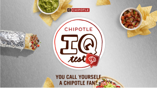 Beginning at 9:01am ET today through Thursday at 11:59pm ET, play for your chance to win! Chipotle Rewards Members can play Chipotle IQ, a 10 question quiz to test your Chipotle knowledge.