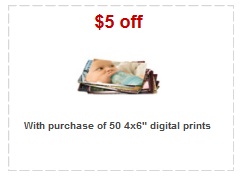 There’s a Target.com printable coupon for $5 off 50 4″x6″ prints AND Target’s 4″x6″ prints are on sale for 10¢ each.  Use the coupon and sale together for 50 free prints!