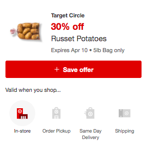 Check your Target app! We have a new Circle offer that you can load to save 30% off Russet Potatoes when you shop in-store. I love it when we see Circle deals on vegetables!