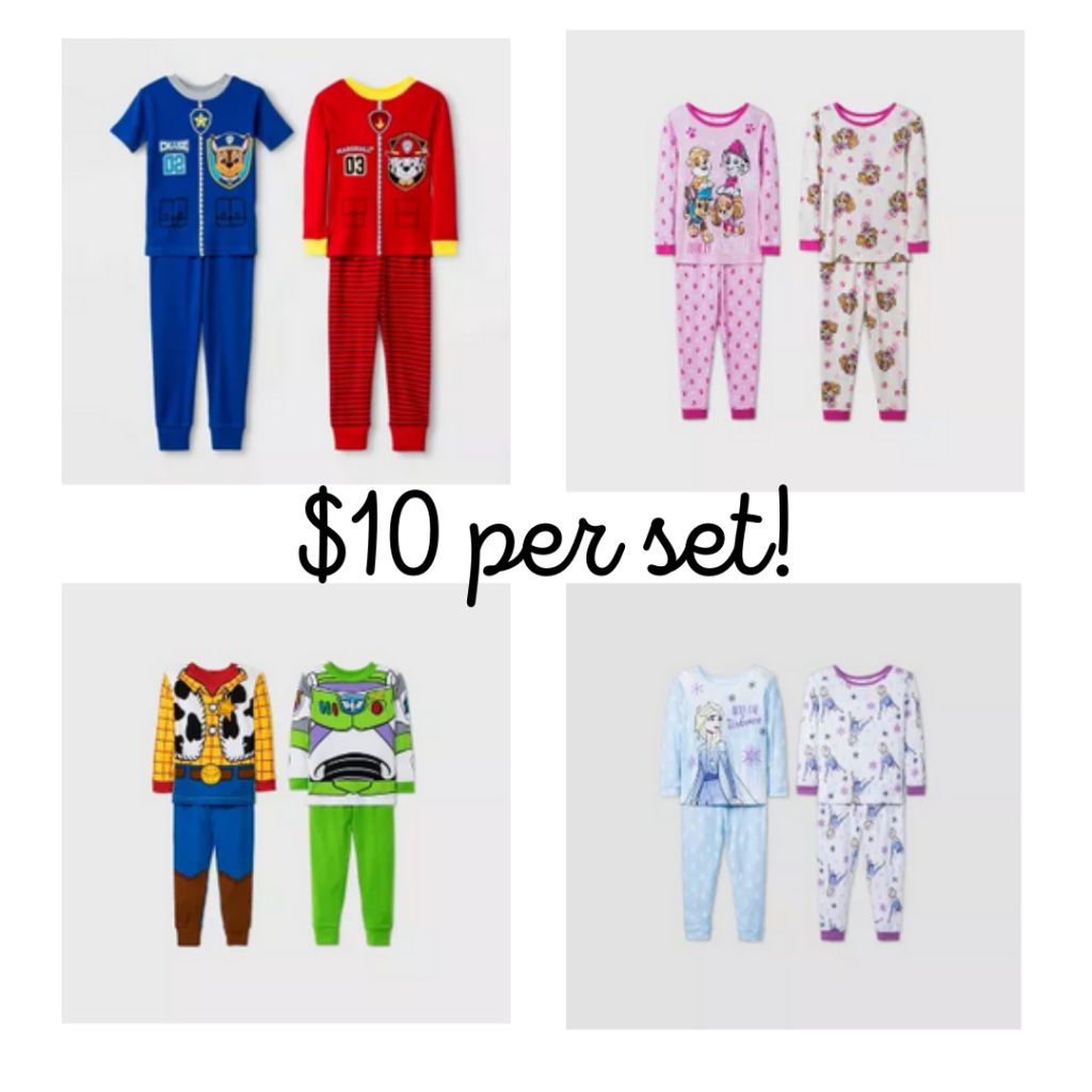 You can get 2 sets of pajamas at Target for $10. There are fun characters included like Frozen, Paw Patrol & PJ Mask.