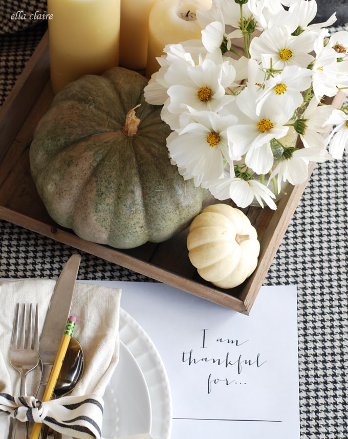Give each guest a placemat and a pen for them to write down what they’re thankful. Not only is this placemat so cute, but it’s thoughtful. Have everyone go around and share what they wrote. Bonus: it’ll give the kids something to draw on.