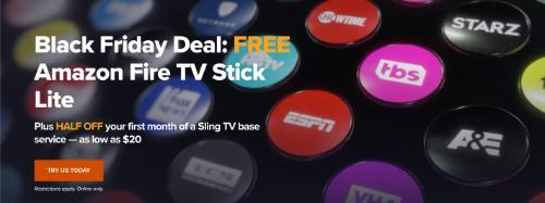 Want to stream more live TV? Try SlingTV with a Black Friday offer and pay $20 for your first month plus get a free Amazon Fire Stick Lite.