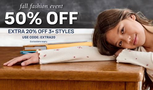 Right now at The Children’s Place, use this code to get an extra 20% off 3+ item orders. This is a great chance to snag some cute fall styles!