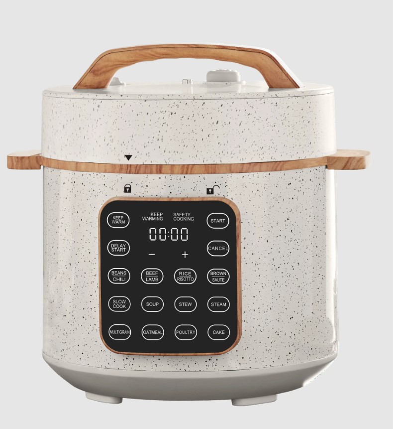 This Pressure Cooker features a touch display and has the following functions: pressure cook, slow cook, sauté, rice, yogurt, steam and warm. It’s currently available only in the Linen Speckle color.