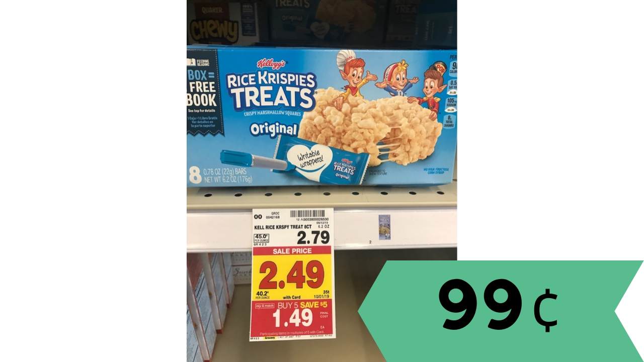 Right now during the Kroger Mega Event, pick up Kellogg’s Rice Krispies Treats for just 99¢ per box with the scenario below!