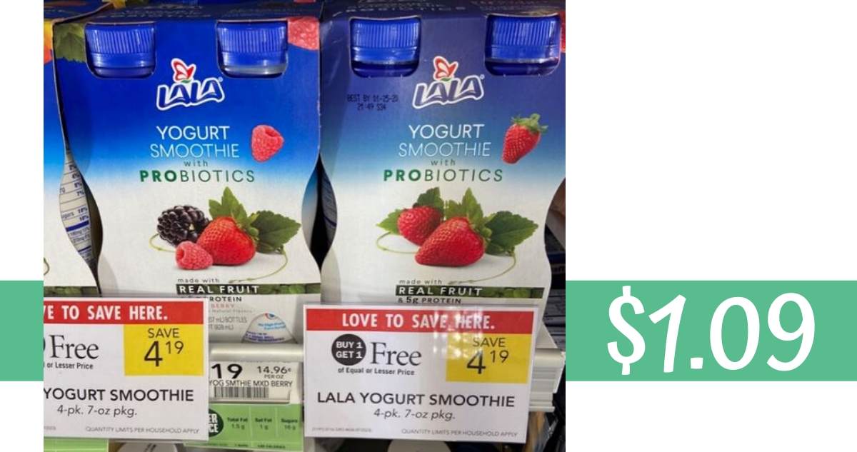 Head over to your local Publix or Walmart where you can use a printable coupon to get a 4 pack of LaLa Yogurt Smoothies for $1.09!