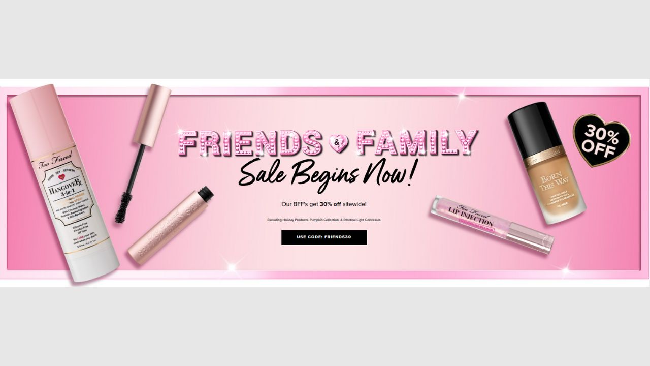 Hop on over to the Friends and Family Sale at Too Faced Cosmetics. They’re offering 30% off everything sitewide!