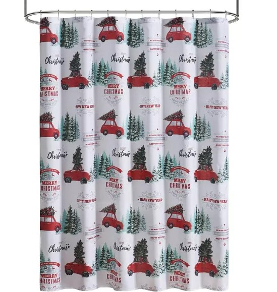 Kate Aurora Tis The Season Holiday Pick Up Truck & Christmas Trees Fabric Shower Curtain – $18 (reg. $30)