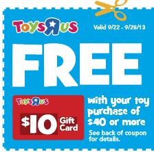 Toys R Us is offering a FREE $10 Toys R Us gift card when you make a $40 or more toy purchase. The coupon is available to clip on the front page of this week’s ad or if you can’t get your hands on the ad, you can print it here to bring in-store.
