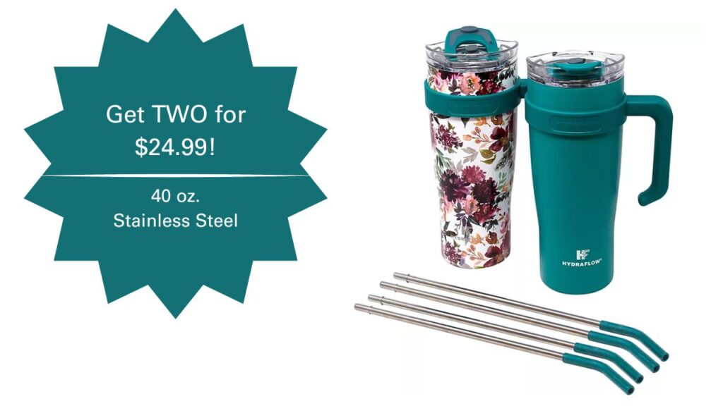 The Hydraflow Double Wall 40 oz. Tumblers are availble in assorted colors. The 3-in-1 lid design allows you to sip, drink or gulp. Straws included. Beverages stay hot for up to 6 hours and cold for up to 12 hours. Best of all, they are dishwasher safe!