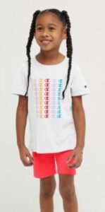 Champion | White Repeat Logo Tee & Stone Red Bike Shorts – Girls – $17.99 (reg. $26)