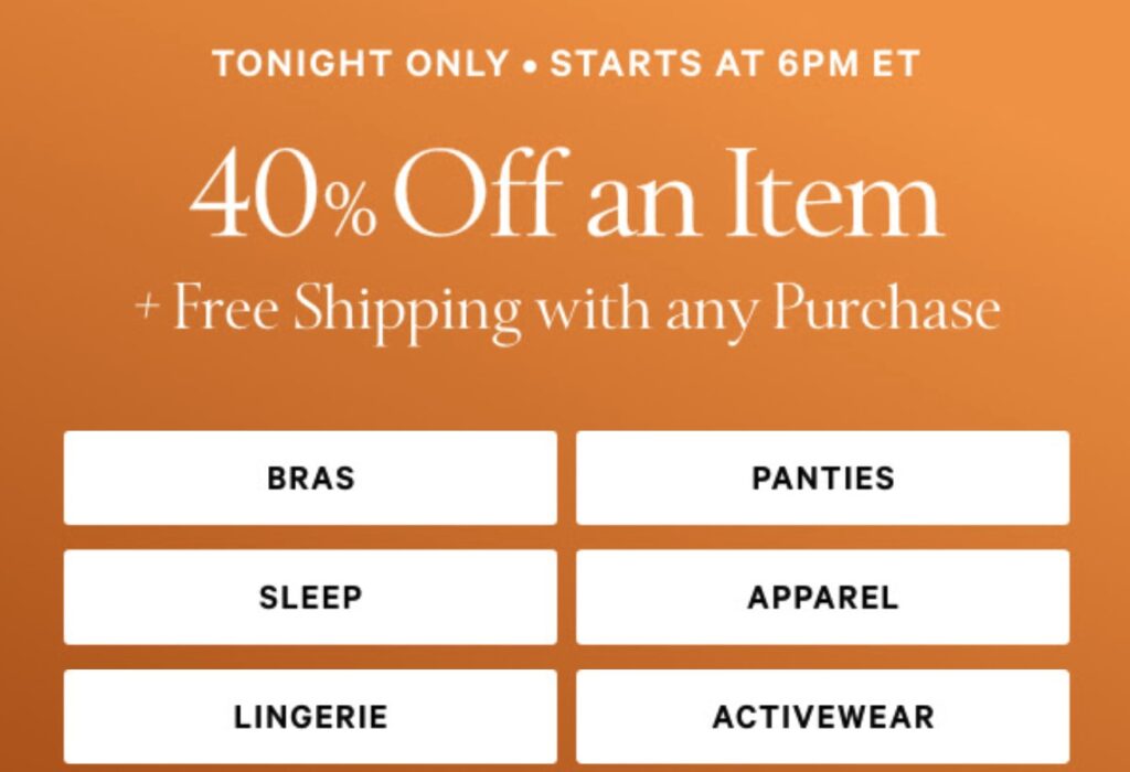 Set a reminder to shop at Victoria’s Secret tonight at 6pm ET because they are offering 40% off any one item and free shipping on any order!