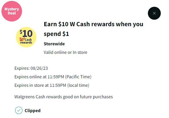 Select customers can earn $10 Walgreens Cash when you spend just $1 storewide! You must clip the coupon and shop online or in-store by 8/26 to earn your rewards.