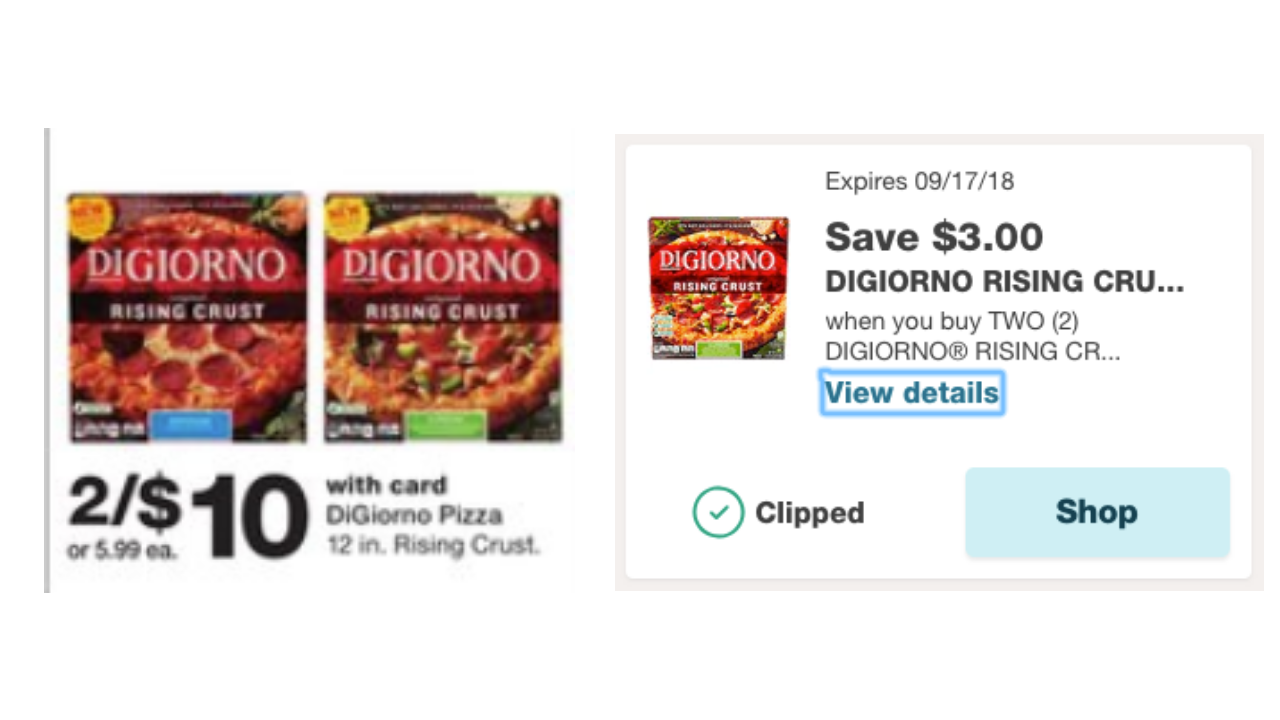 - DiGiorno Pizza, 27.5-31.5 oz, 2 for $10
