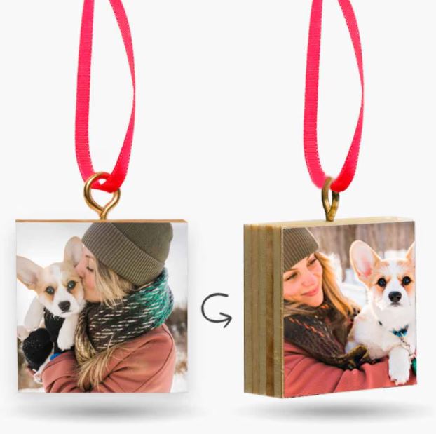 You can choose two separate images – one on each side – and it comes with an eyelet and ribbon for hanging! Plus, each ornament is finished with a clear varnish natural wood coating for longevity.
