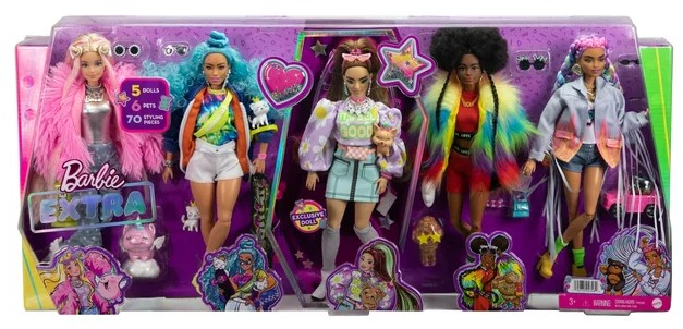Barbie Extra 5-Doll Set with 6 Pets & 70 Styling Pieces – $70