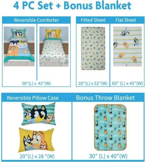 This set comes with a fitted sheet, top sheet, a reversible comforter, a reversible pillow case, plus a bonus fleece blanket!