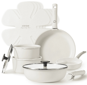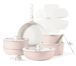 Most of these pots and pans sets come with a detachable handle (Carote’s trademark) to help you save space in your kitchen cabinets.