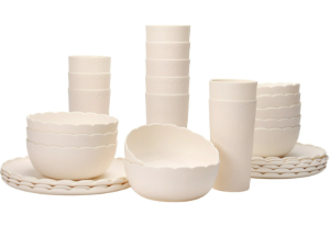 This 30-piece set includes 10 each of plates, bowls, and cups. Everything stacks and stores easily! This set is great for casual family meals, outdoor summer dining, or for non-breakable extras when nieces and nephews or grand kids are in town.