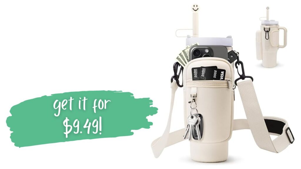 This water bottle carrier bag with adjustable, removable strap features a phone pocket with card holder in front. It’s a perfect fit for your 40-ounce Stanley! Grab it pink, cream or beige.