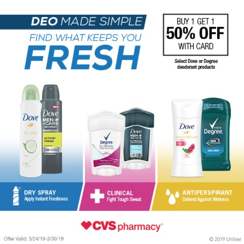 Once you find out what deodorant is your deodorant soul mate, head to CVS this week to get them on sale (plus use coupons). Select Dove and Degree Deodorants are on sale Buy One Get One 50% off.