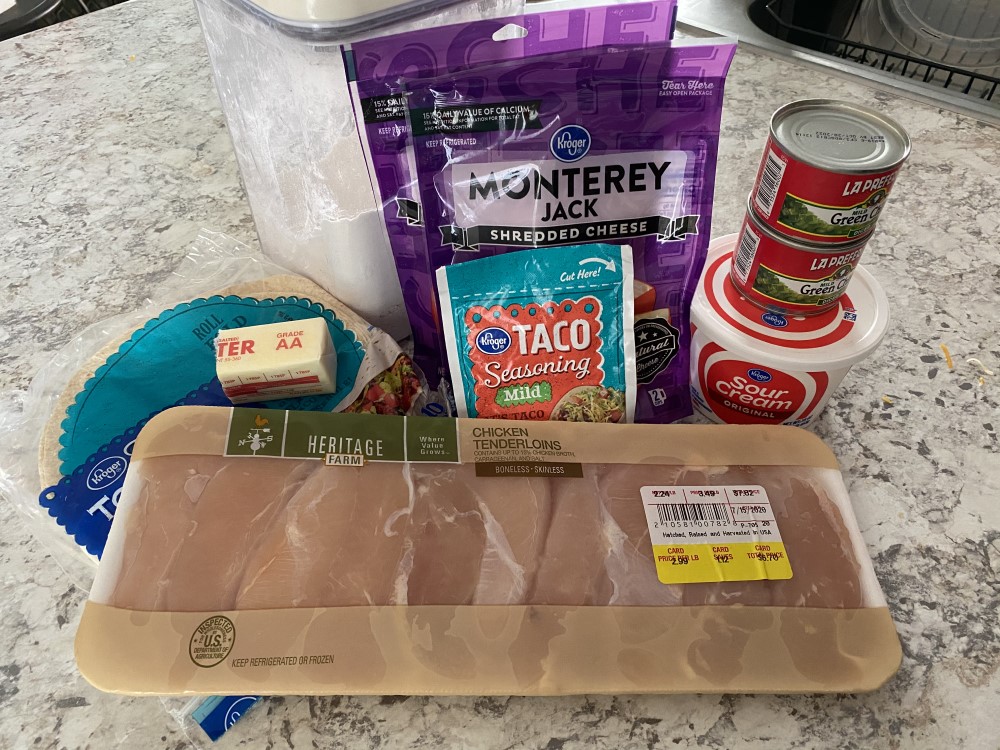 - Line up the ingredients for making the enchiladas: Tortillas, chicken, cheese, and sauce.