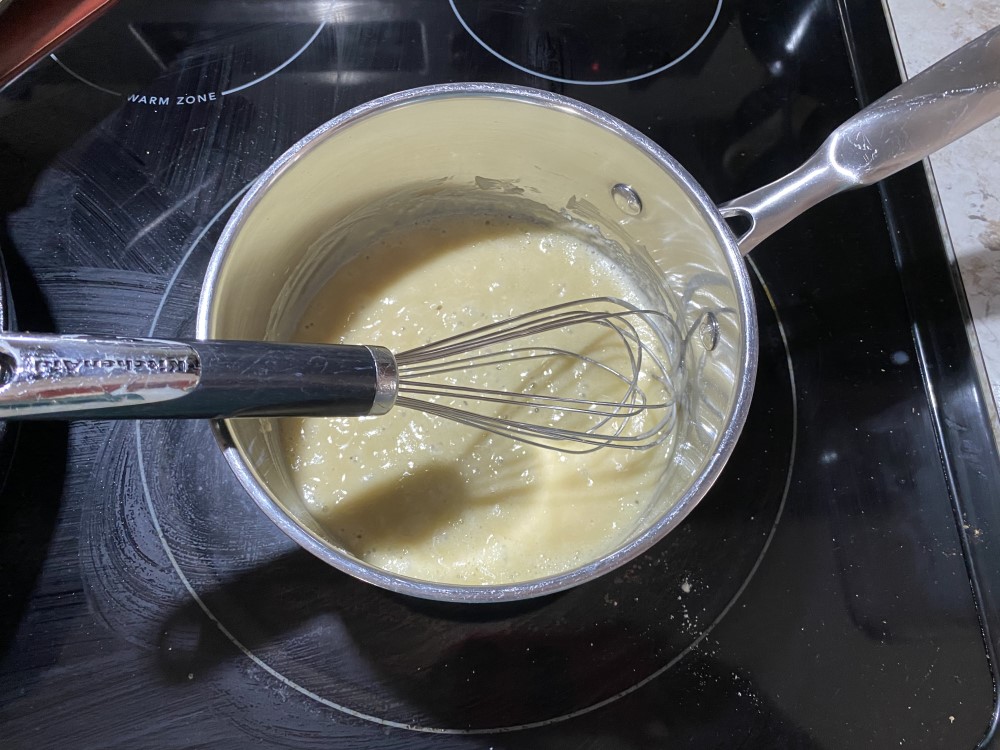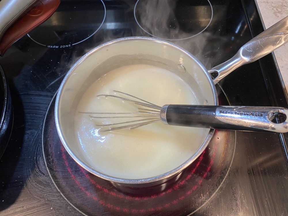 Slowly add the 2 cups of chicken broth, while continuing to stir. Reduce the heat if it starts to bubble too much and continue to cook until the sauce begins to thicken. Once the sauce is thick enough, remove it from the heat and let it cool while you work on the other parts of the dish.
