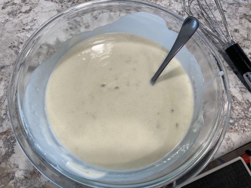- Put the green chiles and the sour cream in a large bowl, then add the cooled roux (butter/flour/chicken broth mixture).