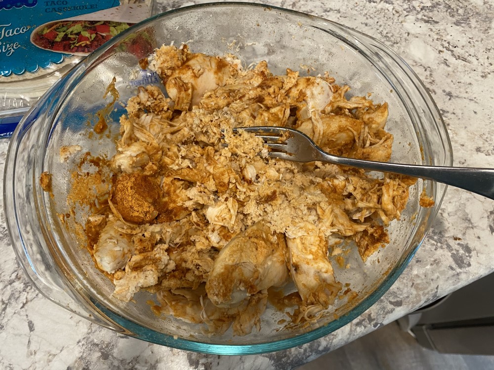 - Stir together the taco seasoning with the cooked, shredded chicken (you can use my homemade taco seasoning recipe and also check out how to make Instant Pot shredded chicken).