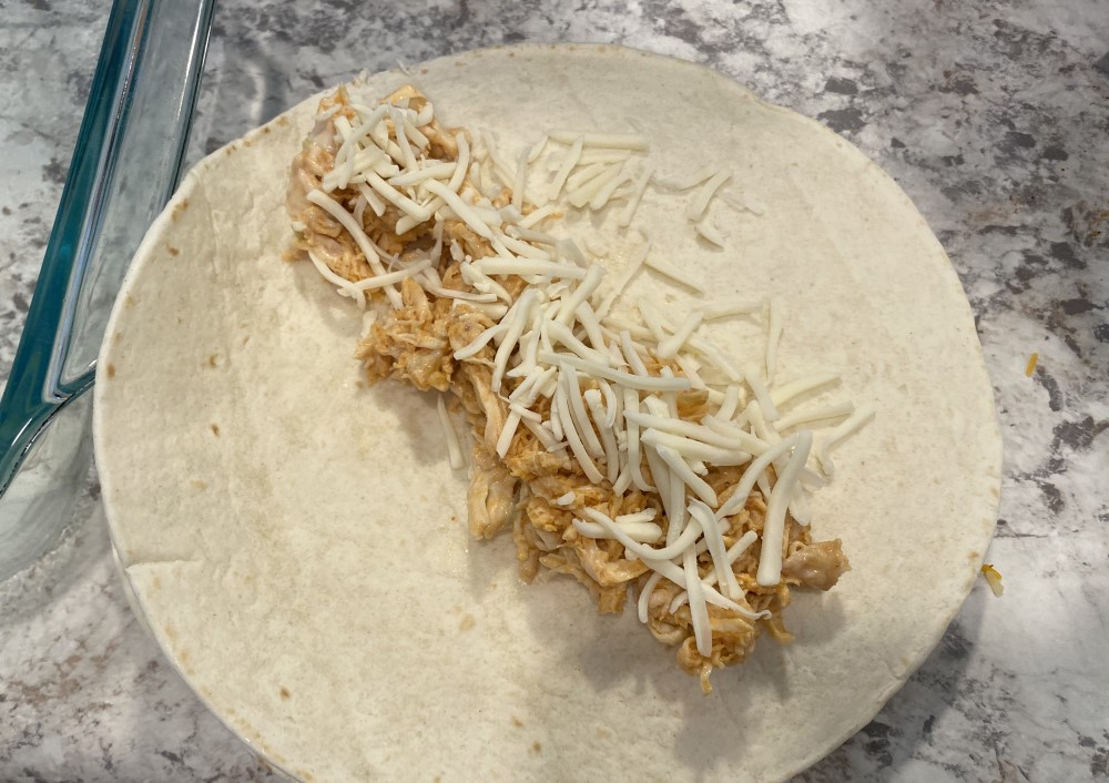 For each enchilada, put about ½ cup of chicken and ¼ cup of cheese down the center of each tortilla.