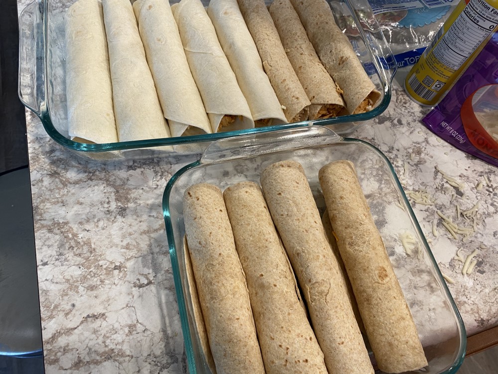 - For each enchilada, put about ½ cup of chicken and ¼ cup of cheese down the center of each tortilla, then roll it up and put it in a 9x13 pan. Do this until you have 8 large enchiladas.